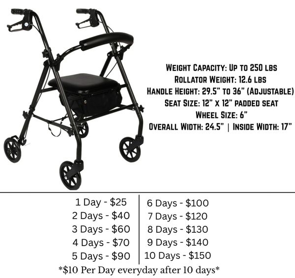 Lightweight, adjustable, & easy to use - for seniors, adults, & anyone that needs mobility. Hand brakes for safe stops. Under-seat storage bag for personal items. Padded seat & backrest. Easy grip handles. Folds quickly. Fits users from 4'11" to 6'4".